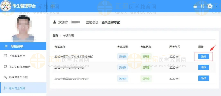 點(diǎn)擊左側(cè)導(dǎo)航欄“進(jìn)入網(wǎng)上報(bào)名”,選擇“2022年度衛(wèi)生專業(yè)技術(shù)資格考試”。
