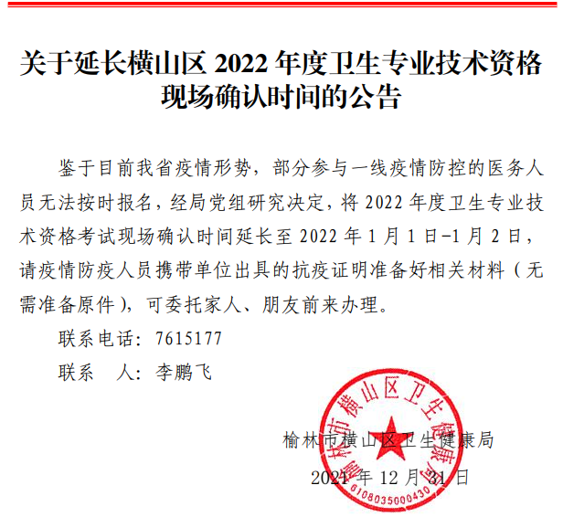 關(guān)于延長橫山區(qū)2022年度衛(wèi)生專業(yè)技術(shù)資格現(xiàn)場確認(rèn)時間的公告