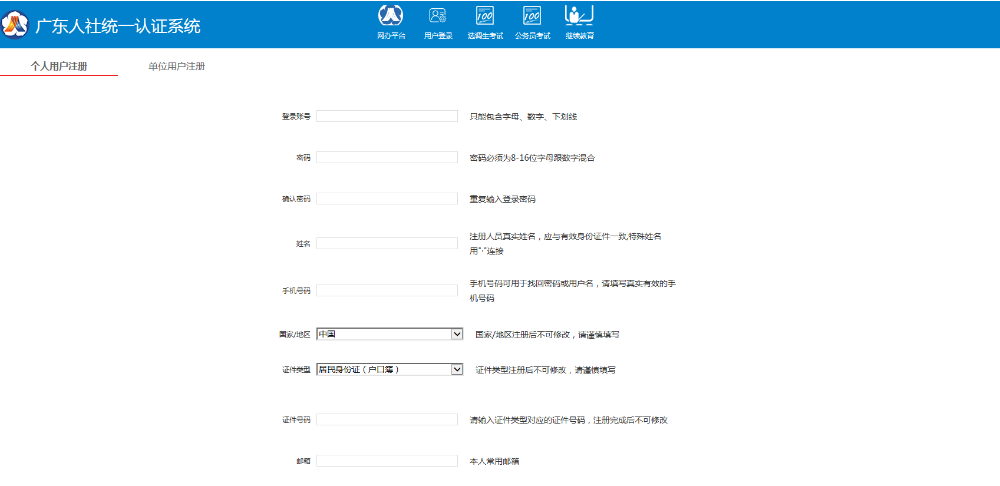 已在廣東省人力資源和社會(huì)保障廳網(wǎng)上服務(wù)平臺(tái)注冊(cè)的用戶,請(qǐng)使用原用戶名、密碼登錄電子證書系統(tǒng),無(wú)需再次注冊(cè);未在該平臺(tái)注冊(cè)過(guò)的用戶,在系統(tǒng)入口請(qǐng)點(diǎn)擊注冊(cè)按鈕進(jìn)入個(gè)人用戶注冊(cè)界面,如實(shí)填寫姓名、證件類型、證件號(hào)碼、手機(jī)號(hào)碼和郵箱等個(gè)人信息后即完成注冊(cè)。