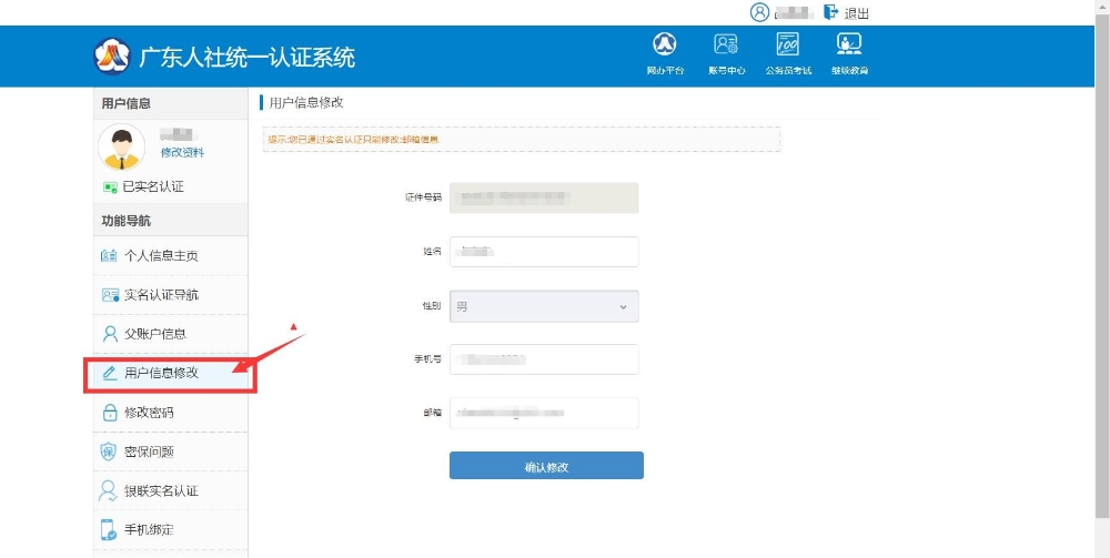 在賬號(hào)中心界面,點(diǎn)擊用戶信息修改按鈕可以對(duì)個(gè)人注冊(cè)信息進(jìn)行修改。注:個(gè)人證件號(hào)碼不可修改;姓名在個(gè)人實(shí)名認(rèn)證后不可修改。