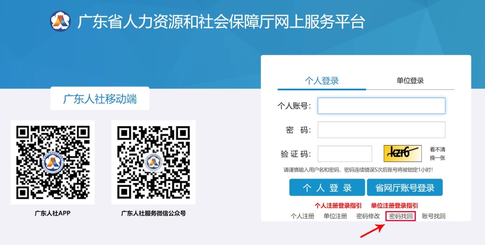 在系統(tǒng)入口點(diǎn)擊登錄按鈕進(jìn)入廣東省人力資源和社會(huì)保障廳網(wǎng)上服務(wù)平臺(tái)的個(gè)人登錄界面,輸入正確的賬號(hào)、密碼和驗(yàn)證碼后即可登錄。