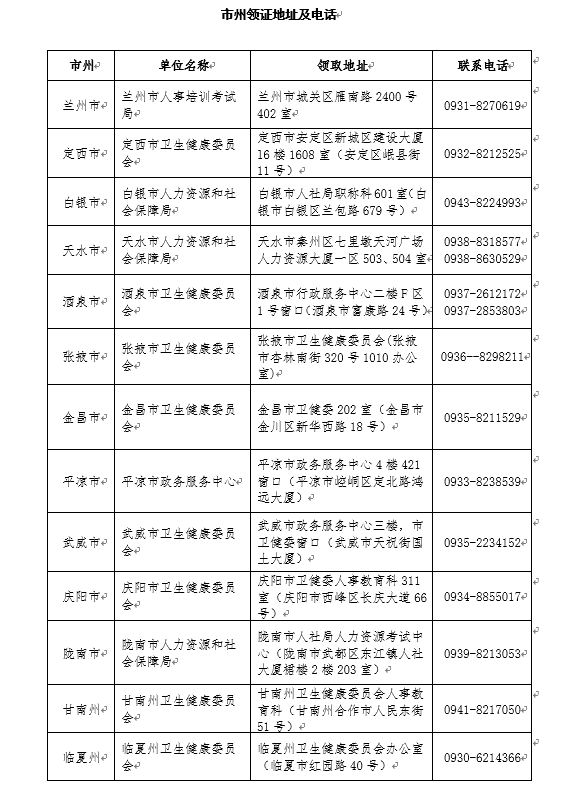 甘肅省2021年度衛(wèi)生專業(yè)技術資格證書于近日開始發(fā)放,請考生到報名所屬地的市州領取,具體事宜請撥打市州聯(lián)系電話咨詢。