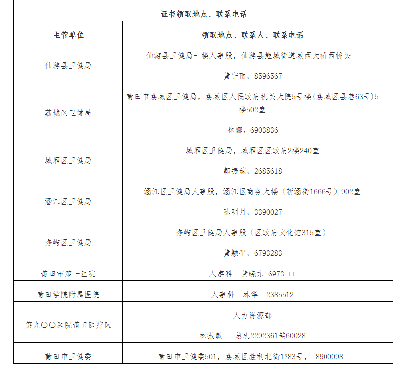 4、具體證書領取地點、聯(lián)系電話見下表。請廣大考生盡快領取衛(wèi)生專業(yè)技術資格證書,并妥善保管。