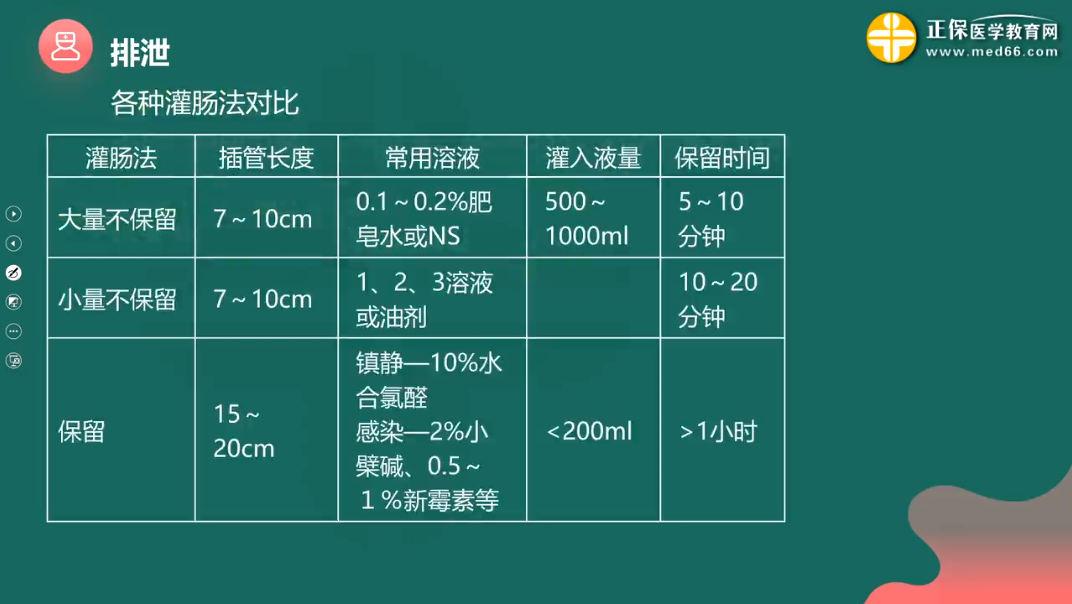 根據(jù)灌腸的目的可分為保留灌腸和不保留灌腸。根據(jù)灌入的液體量又可將不保留灌腸分為大量不保留灌腸和小量不保留灌腸。在教材中,需要考生們掌握的是: