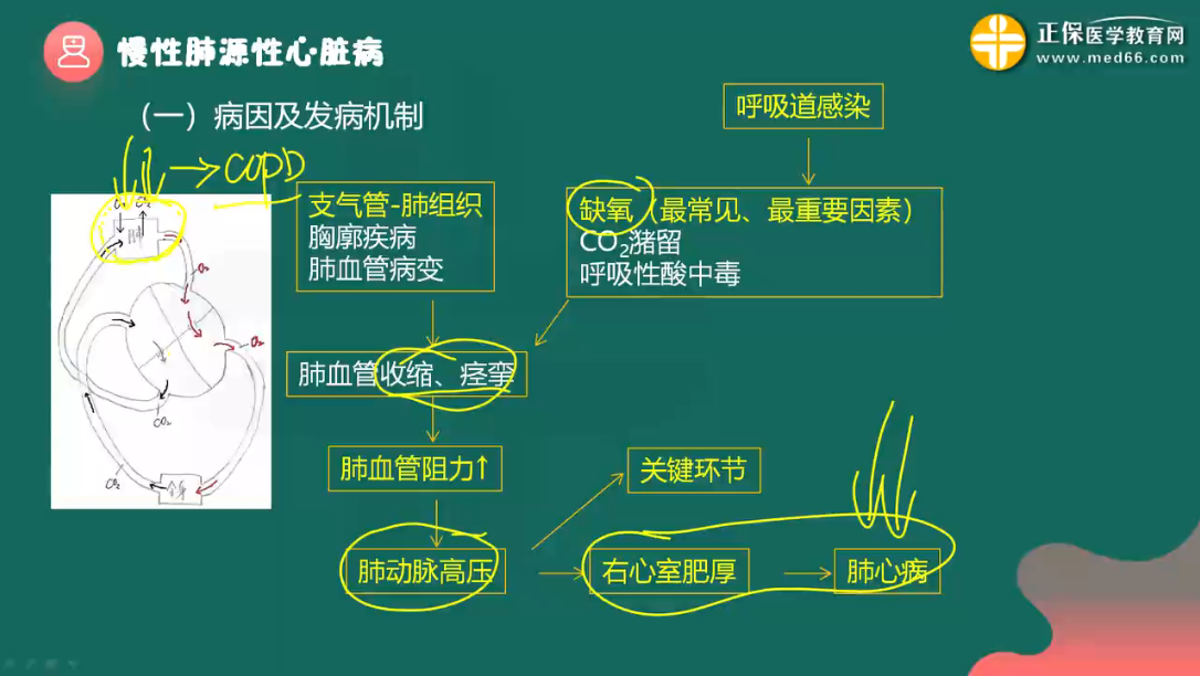 肺源性心臟病簡稱肺心病,根據(jù)起病緩急和病程長短,可分為急性和慢性肺心病兩種,考綱中涉及到的是慢性肺源性心臟病,此病也是我國呼吸系統(tǒng)的常見病,在考試中,該病常以病例分析題的形式出現(xiàn),想要快速準(zhǔn)確的判斷出該疾病則需要掌握其臨床特點,想要學(xué)明白這個疾病,則需要掌握其發(fā)病機制,簡單來說: