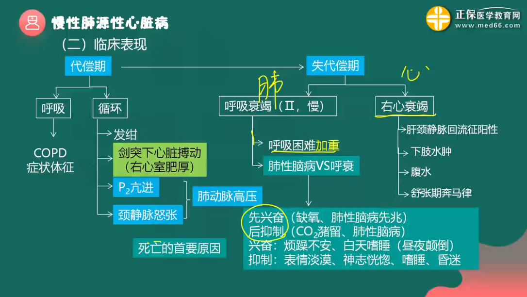 2.慢阻肺所致的肺循環(huán)阻力增加導(dǎo)致肺動脈高壓,右心代償,發(fā)生右心室肥厚;右心失代償而致右心衰竭;