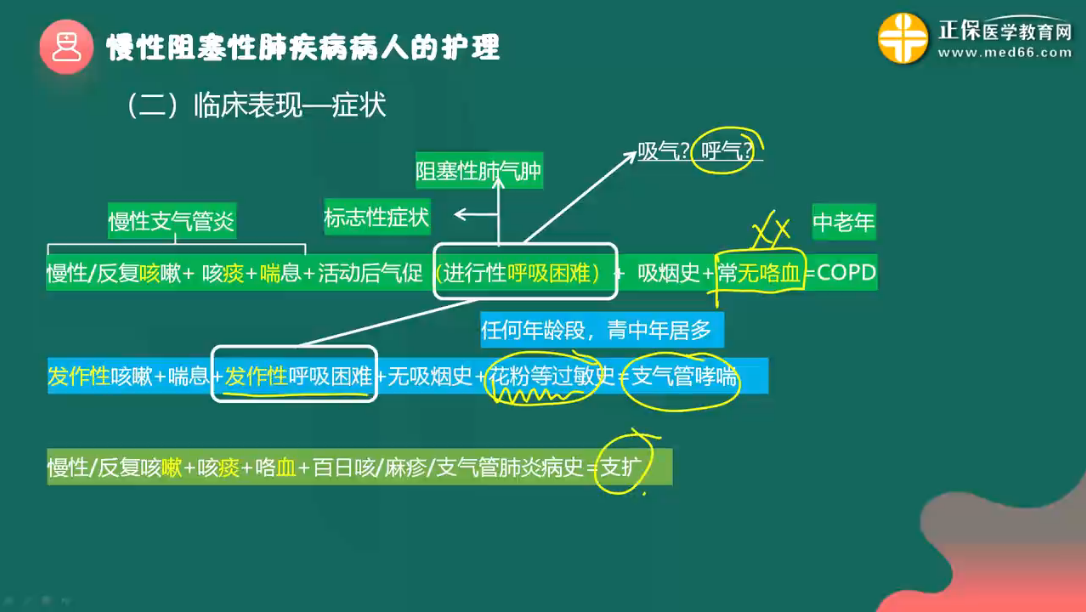 1.慢性阻塞性肺氣腫和支氣管哮喘都會(huì)出現(xiàn)呼吸困難,但慢阻肺是進(jìn)行性呼吸困難;支氣管哮喘是發(fā)作性呼吸困難;