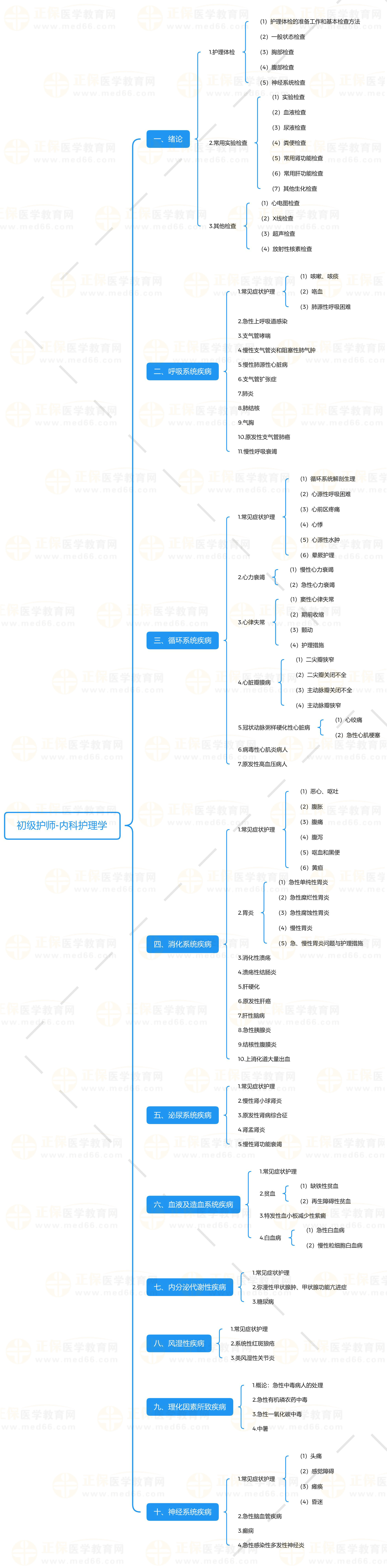 初級(jí)護(hù)師考試實(shí)行全國(guó)統(tǒng)一組織、統(tǒng)一考試時(shí)間、統(tǒng)一考試大綱、統(tǒng)一考試命題、統(tǒng)一合格標(biāo)準(zhǔn)的考試制度,原則上每年進(jìn)行一次。2024年初級(jí)護(hù)師考試新考期已經(jīng)開始了,為了幫助各位考生理清考試知識(shí)點(diǎn)脈絡(luò),更有針對(duì)性復(fù)習(xí),醫(yī)學(xué)教育網(wǎng)為大家整理初級(jí)護(hù)師《內(nèi)科護(hù)理學(xué)》知識(shí)點(diǎn)地圖如下: