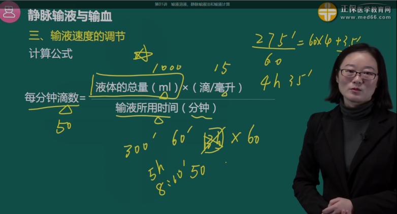 已知每分鐘滴數(shù)與輸液總量,計(jì)算輸液所需的時(shí)間:輸液時(shí)間(h)=[輸液總量(ml)×滴系數(shù)]/[每分鐘滴數(shù)×60(min)]