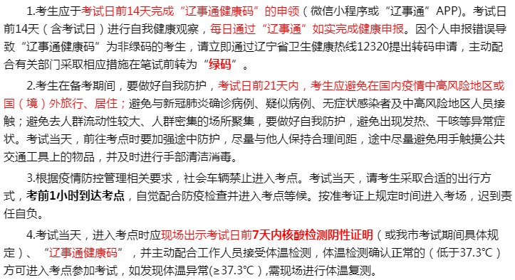 5.入場時體溫復(fù)測仍異常(≥37.3℃)、有干咳等呼吸道癥狀、“遼事通健康碼”非綠碼或考前14天內(nèi)有國內(nèi)疫情中高風(fēng)險地區(qū)所在城市(重點(diǎn)關(guān)注地區(qū))旅居史的考生,應(yīng)提供考前72小時內(nèi)(或按考點(diǎn)所在地的具體規(guī)定)核酸檢測陰性證明,以及三級甲等醫(yī)院出具明確的醫(yī)學(xué)診斷證明或經(jīng)考點(diǎn)防疫副主考和駐點(diǎn)醫(yī)生綜合研判具備參考條件,否則不得參加考試。
