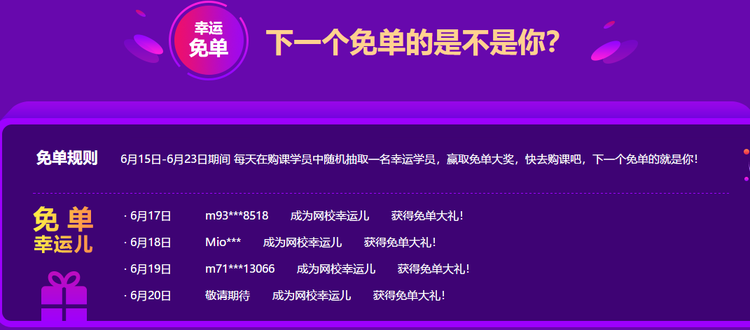 醫(yī)學(xué)教育網(wǎng)年中鉅惠活動倒計(jì)時!截止活動結(jié)束前,每天在購課學(xué)員中隨機(jī)抽取一名幸運(yùn)學(xué)員,贏取免單大獎,信不信,下一個免單的就是你!。