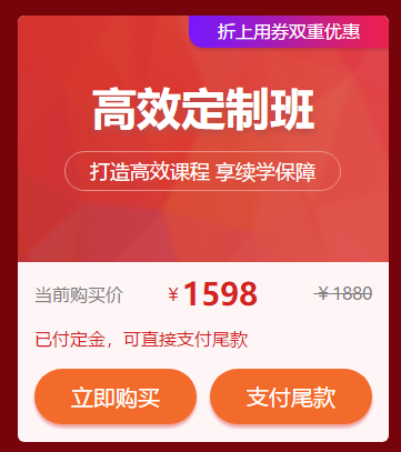 (2)11月11日之前已付定金的同學,可享受8折優(yōu)惠,折上用券也享受雙重優(yōu)惠!快去支付尾款吧!