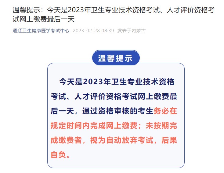 通遼衛(wèi)生健康醫(yī)學(xué)考試中心發(fā)布2023年衛(wèi)生專業(yè)技術(shù)資格考試網(wǎng)上繳費溫馨提示,具體內(nèi)容如下: