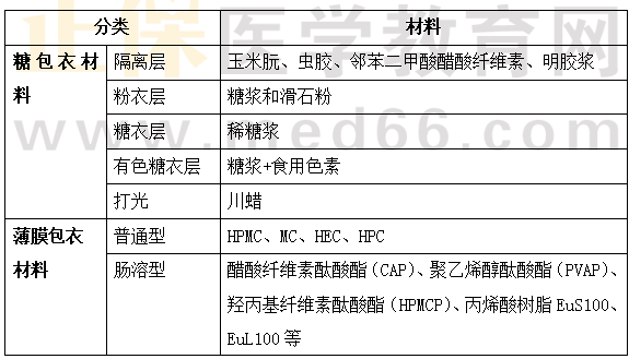 【解答】糖包衣片和薄膜包衣片包衣材料如下表: