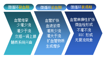 (1)微循環(huán)改變:灌而少流,灌大于流,組織呈淤血性缺氧狀態(tài)