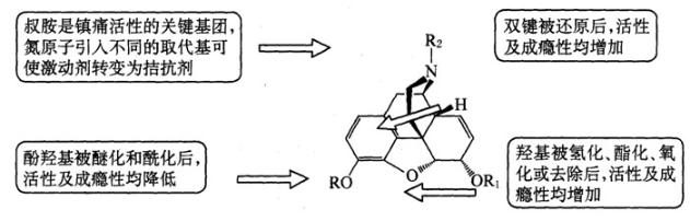 修飾3-位酚羥基、6-位醇羥基以及7~8位雙鍵得到的化合物,鎮(zhèn)痛作用提高,成癮性也增強(qiáng)。