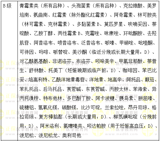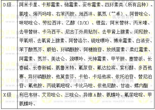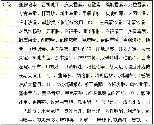 4.【答案及解析】A。乙酰洋地黃毒苷是抗心力衰竭藥B級,去乙酰毛花苷是C級,肼屈嗪是降壓藥B級、氯化銨是呼吸系統(tǒng)用藥B級,卡維地洛是C級,妊娠中晚期為D級。