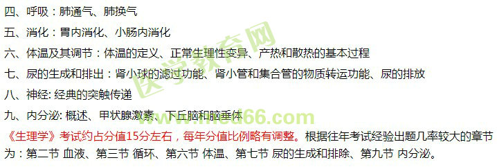 《生理學(xué)》共九節(jié):細(xì)胞的基本功能、血液、循環(huán)、呼吸、消化、體溫及其調(diào)節(jié)、尿的生成和排出、神經(jīng)、內(nèi)分泌。