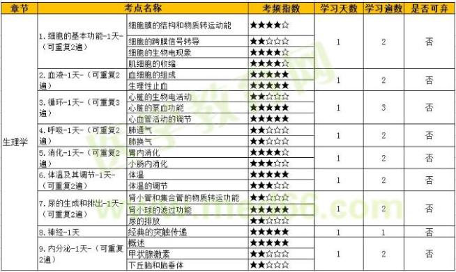 初級(jí)藥士基礎(chǔ)知識(shí)生理學(xué)主要涉及考點(diǎn)有細(xì)胞的基本功能、血液、循環(huán)、呼吸、消化、體溫及其調(diào)節(jié)、尿的生成和排出、神經(jīng)及內(nèi)分泌部分的內(nèi)容。學(xué)習(xí)計(jì)劃為: