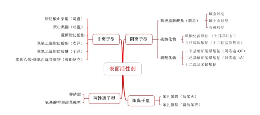 表面活性劑在液體制劑是一種比較重要的輔料,常用作乳化劑、增溶劑、防腐劑等,所以是一個(gè)比較重要的知識(shí)點(diǎn)。但是由于大家在平時(shí)的工作生活中很少會(huì)涉及或者接觸到這部分知識(shí),因此學(xué)習(xí)起來(lái)會(huì)覺得有困難,不知道如何下手。首先,對(duì)于這部分內(nèi)容,一定要先從整體上看需要大家掌握什么,表面活性劑這里要求大家掌握的是分類、應(yīng)用和生物學(xué)性質(zhì)三方面。其次,對(duì)于每一個(gè)知識(shí)點(diǎn)在學(xué)習(xí)的時(shí)候可以把相關(guān)的內(nèi)容總結(jié)成圖表的方式,方便大家結(jié)合起來(lái)對(duì)比記憶。比如對(duì)于表面活性劑的分類可以總結(jié)如下圖: