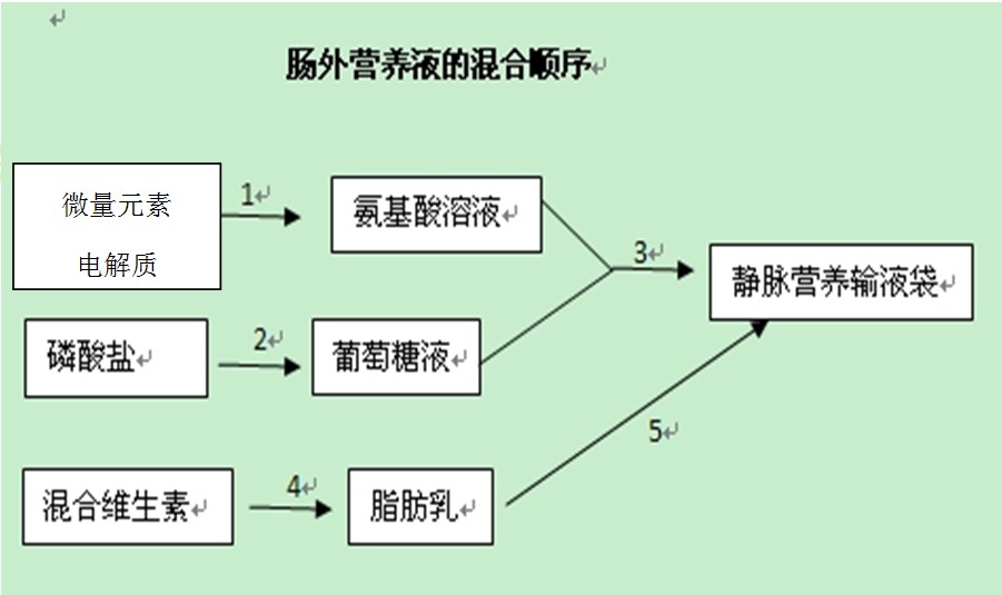 腸外營(yíng)養(yǎng)液的配制這部分內(nèi)容比較多,且比較雜,需要大家記憶的內(nèi)容也多。[醫(yī)學(xué)教育網(wǎng)原創(chuàng)]很多學(xué)員反映不知道怎么學(xué)習(xí),在這里老師建議大家可以把這部分重點(diǎn)內(nèi)容羅列出來(lái),對(duì)重點(diǎn)需要記憶的內(nèi)容通過圖表的形式進(jìn)行總結(jié)。[醫(yī)學(xué)教育網(wǎng)原創(chuàng)]比如,腸外營(yíng)養(yǎng)液的混合順序可以通過下圖方式畫出來(lái),方便大家記憶。