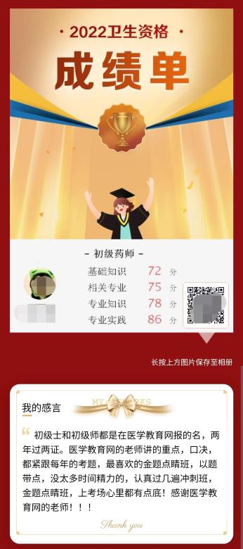 真的恭喜這位學(xué)員,能夠在醫(yī)學(xué)教育網(wǎng)老師的陪伴下,過五關(guān)斬六將,順利取證!小編也想對正在準備參加藥學(xué)職稱考試的考生說,希望通過這位學(xué)員的分享可以讓大家更加信賴醫(yī)學(xué)教育網(wǎng)的老師,相信醫(yī)學(xué)教育網(wǎng)課程的品質(zhì)!去試聽課程>