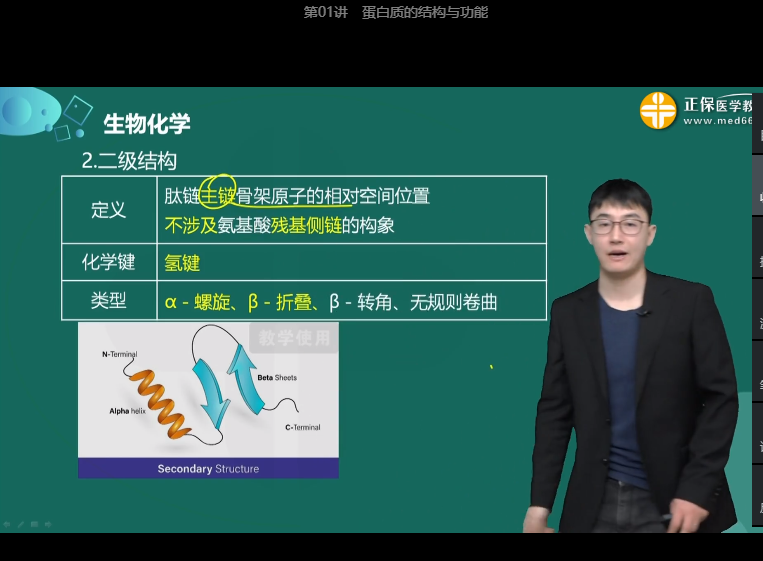 蛋白質(zhì)的二級結(jié)構(gòu)指蛋白質(zhì)分子中某一段肽鏈的局部空間結(jié)構(gòu),也就是該肽鏈主鏈骨架原子的相對空間位置,并不涉及氨基酸殘基側(cè)鏈的構(gòu)象。蛋白質(zhì)的二級結(jié)構(gòu)包括a螺旋、β折疊、β轉(zhuǎn)角和無規(guī)則卷曲。維持蛋白質(zhì)二級結(jié)構(gòu)的化學(xué)鍵是氫鍵。
