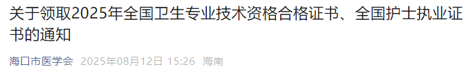 2025年全國(guó)衛(wèi)生專業(yè)技術(shù)資格合格證書(簡(jiǎn)稱初、中級(jí),中藥士(師)、藥士(師)、技士(師)、護(hù)師......主管、主治等)和2025年全國(guó)護(hù)士執(zhí)業(yè)資格合格證書已開始發(fā)放,請(qǐng)考生于2025年8月13日-9月12日憑身份證到??谑嗅t(yī)學(xué)會(huì)(??谑?20急救中心5樓537房)領(lǐng)取。