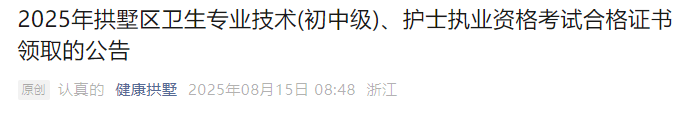 2025年度拱墅區(qū)衛(wèi)生專業(yè)技術(初中級)、護士執(zhí)業(yè)資格考試合格證書已由杭州市衛(wèi)生健康委下發(fā)至我區(qū),現(xiàn)將領取有關事項通知如下: