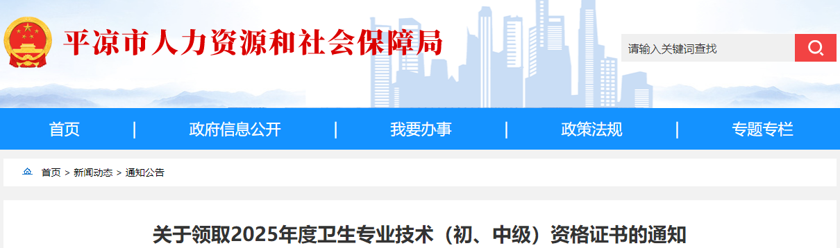 平?jīng)鍪?025年度衛(wèi)生專業(yè)技術(shù)(初、中級)資格證書開始發(fā)放,請參加平?jīng)鍪行l(wèi)生專業(yè)技術(shù)(初、中級)資格考試且成績合格的考生于2025年8月25日至2025年11月28日(工作日)到平?jīng)鍪袇^(qū)政務(wù)服務(wù)中心三樓3-112窗口領(lǐng)取。本人領(lǐng)取須攜帶身份證(社??ǎ┰?,委托他人代領(lǐng)需攜帶應(yīng)試人員身份證(社??ǎ┰驈?fù)印件及代領(lǐng)人身份證(社??ǎ┰?。
