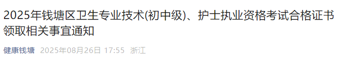 2025年度錢塘區(qū)衛(wèi)生專業(yè)技術(shù)(初中級(jí))、護(hù)士執(zhí)業(yè)資格考試合格證書已由杭州市衛(wèi)生健康委下發(fā)至我區(qū),現(xiàn)將領(lǐng)取有關(guān)事項(xiàng)通知如下: