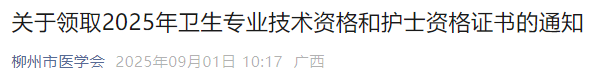 參加2025年衛(wèi)生專業(yè)技術(shù)資格和護士執(zhí)業(yè)資格考試且成績合格的廣西考區(qū)柳州市考點的考生,從2025年9月1日起可領(lǐng)取資格證書,現(xiàn)就領(lǐng)取證書的相關(guān)事宜通知如下: