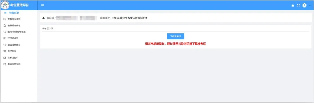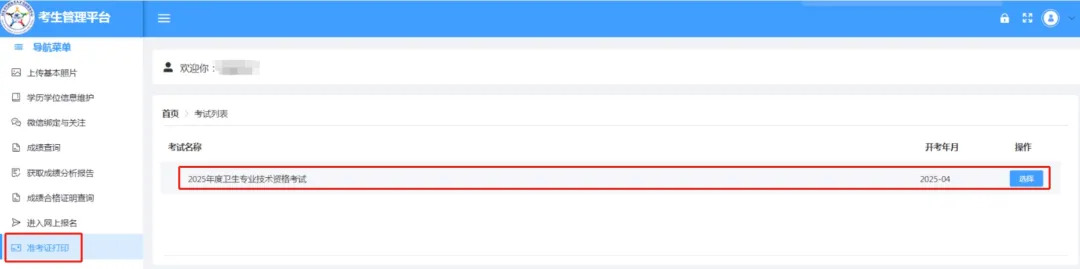 登錄考生管理平臺后,點(diǎn)擊左側(cè)導(dǎo)航欄“準(zhǔn)考證打印”,在考試列表中選擇考試項(xiàng)目。