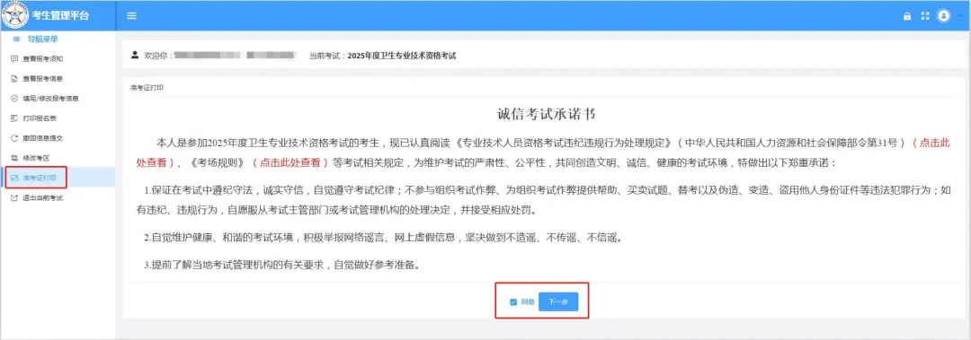 在左側(cè)導(dǎo)航欄選擇“準(zhǔn)考證打印”,認(rèn)真閱讀《誠信考試承諾書》后勾選“同意”,點(diǎn)擊“下一步”。