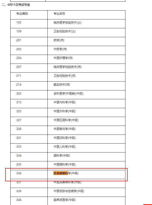 耳鼻咽喉科中級職稱考試2021哪天考?確定為4月11日開考!下圖是中國衛(wèi)生人才網(wǎng)公布的內(nèi)容,其中標(biāo)注了專業(yè)代碼,請大家認(rèn)清,耳鼻咽喉科中級職稱考試專業(yè)代碼是336,以此為準(zhǔn)!