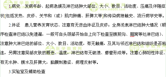 (二)鑒別診斷 不同年齡小兒在不同部位可以觸及淋巴結。正常情況下,小兒1歲時,大多能在枕部、頸部、腹股溝等處觸及淋巴結;2~12歲小兒較易觸及淋巴結,以頸部、腋下、腹股溝為多見。一般而言,淋巴結不超過豌豆大小,單個,質軟,可以移動,無壓痛與毗鄰組織粘連應視為正常。淋巴結腫大需鑒別。