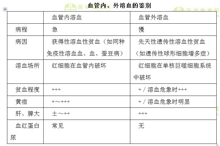 除上述臨床表現(xiàn)外,還要注意血管內(nèi)、外溶血臨床表現(xiàn)有不同的特點(diǎn)(表)。