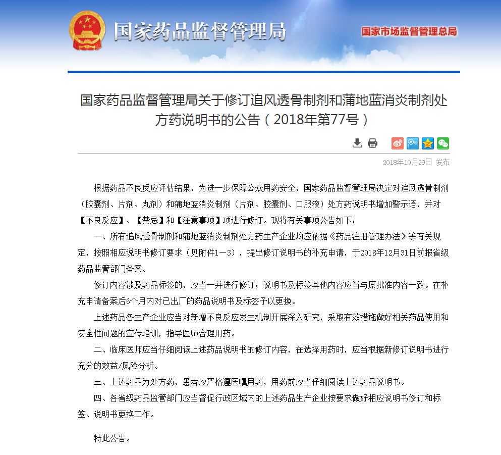 國(guó)家藥監(jiān)局發(fā)布《關(guān)于修訂追風(fēng)透骨制劑和蒲地藍(lán)消炎制劑處方藥說(shuō)明書的公告》已經(jīng)明確要求蒲地藍(lán)消炎制劑修改說(shuō)明書,并對(duì)不良反應(yīng)、禁忌、注意事項(xiàng)等項(xiàng)增加說(shuō)明。