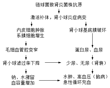 鏈球菌本身的某些成分或代謝產物作為抗原,引發(fā)機體免疫反應,主要是通過形成抗原-抗體免疫復合物(循環(huán)免疫復合物或原位復合物),此復合物激活補體而于腎小球局部致免疫損傷而發(fā)病。
