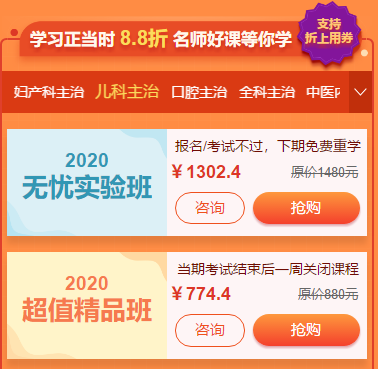活動期間購買兒科主治醫(yī)師考試輔導(dǎo)課程可以享受8.8折優(yōu)惠,可以與學(xué)費紅包同享,立享折上折!