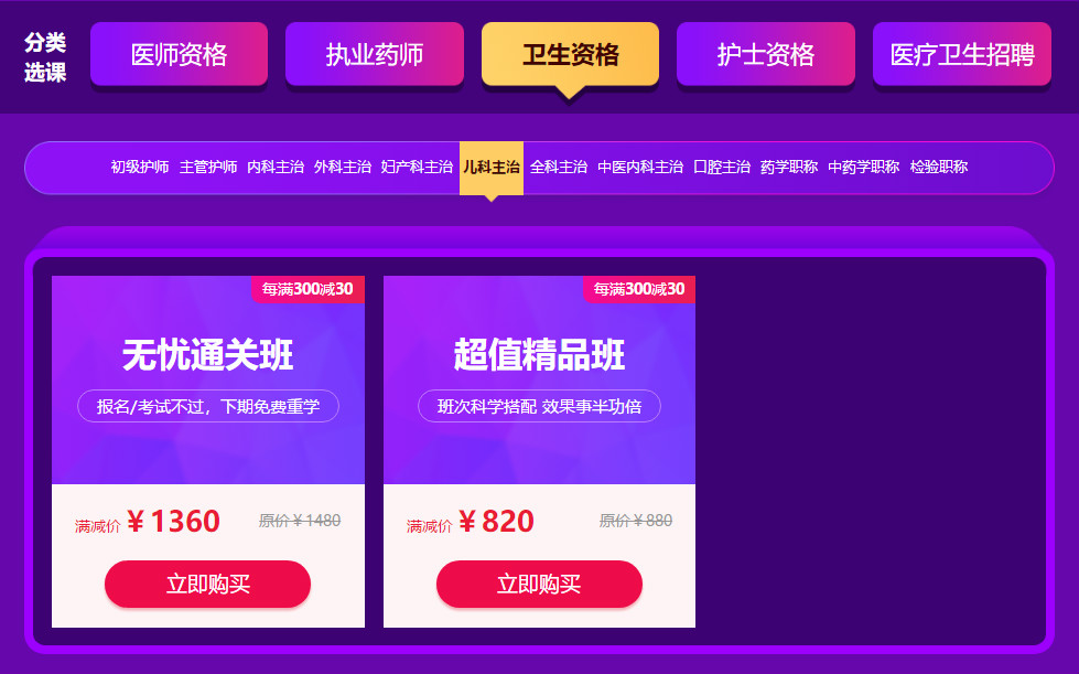兒科主治課程:無憂直達(dá)班、超值精品班均參與此活動(頁面顯示為優(yōu)惠后價格;可與小保學(xué)費疊加使用)
