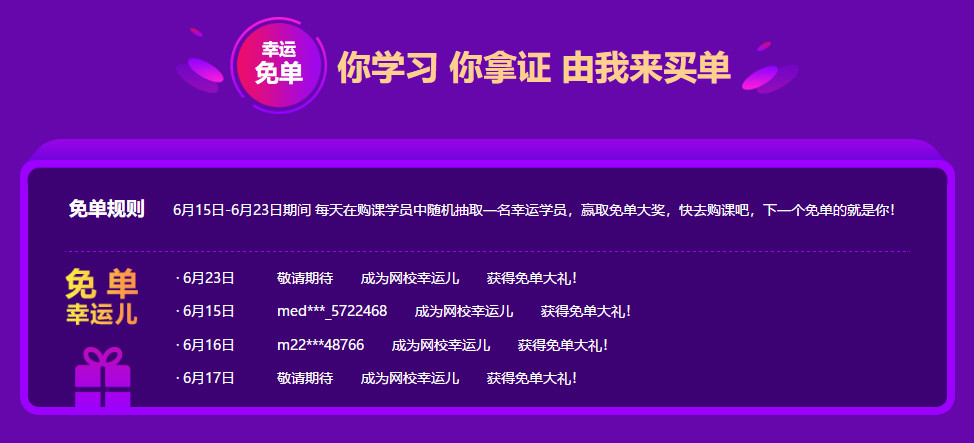 活動期間每天在購課學(xué)員中隨機抽取一名幸運學(xué)員贏取免單大獎,下一個免單的就是你!