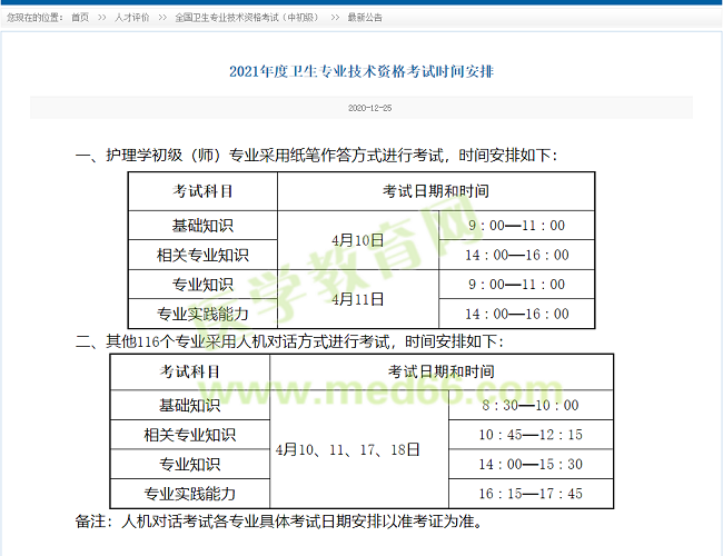 2021年放射醫(yī)學(xué)主治醫(yī)師考試哪天進行?根據(jù)中國衛(wèi)生人才網(wǎng)發(fā)布的內(nèi)容我們知道,今年放射醫(yī)學(xué)主治醫(yī)師考試提前至4月份。具體時間如下: