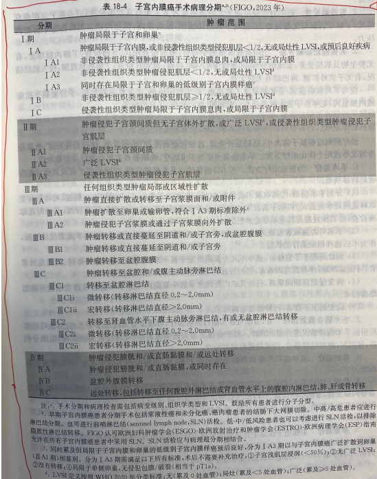 2023:目前被國內(nèi)外廣泛使用的子宮內(nèi)膜癌分期體系是FIGO于2009年推薦使用子宮內(nèi)膜癌手術(shù)病理分期系統(tǒng),見表18-3。