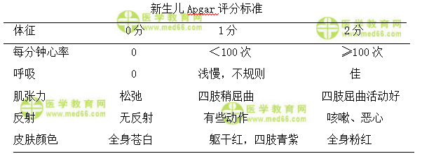 (3)Apgar評分及其意義:根據(jù)新生兒出生后一分鐘內的心率、呼吸、肌張力、喉反射及皮膚顏色5項體征對新生兒進行評分,每項0~2分,滿分為10分,8~10分屬正常新生兒;4~7分為輕度窒息,又稱青紫窒息,需清理呼吸道、人工呼吸、吸氧、用藥等措施才能恢復;3分以下為重度窒息,又稱蒼白窒息,缺氧嚴重需緊急搶救,行喉鏡在直視下氣管內插管并給氧。應在出生后5分鐘、10分鐘時再次評分,直至連續(xù)兩次評分均為≥8分。1分鐘評分反映在宮內的情況,而5分鐘及以后評分則反映復蘇效果,與預后關系密切(表6-1)。新生兒Apgar評分以呼吸為基礎,皮膚顏色最靈敏,心率是最終消失的指標。臨床惡化順序為:皮膚顏色→呼吸→肌張力→反射→心率。復蘇有效順序為:心率→反射→皮膚顏色→呼吸→肌張力。肌張力恢復越快,預后越好。