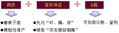 ∮腹部微痛→僅子宮瘢痕部位壓痛→已有子宮瘢痕破裂。