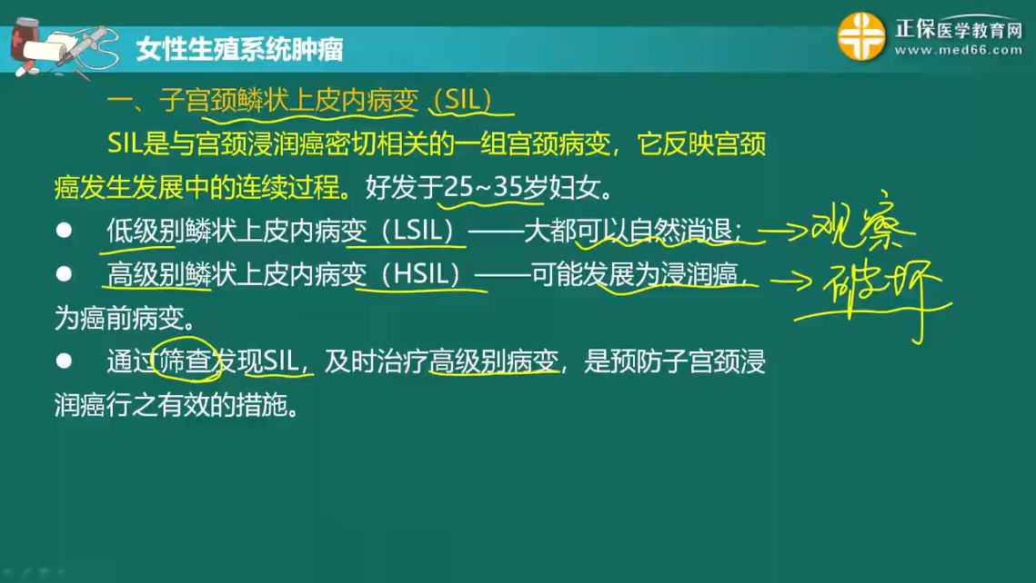 SIL既往稱為“子宮頸上皮內(nèi)瘤變”(CIN),分為3級。WHO女性生殖器腫瘤分類(2014)建議采用與細胞學分類相同的二級分類法(即LSIL和HSIL),LSIL相當于CIN1,HSIL包括CIN3和大部分CIN2。LSIL約60%會自然消退,細胞學檢查為LSIL及以下者可僅觀察隨訪。HSIL可發(fā)展為浸潤癌,需要治療。