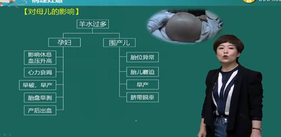 【解析】對(duì)母體的影響羊水過(guò)多時(shí)子宮張力增高,影響孕婦休息而使得血壓升高,加之