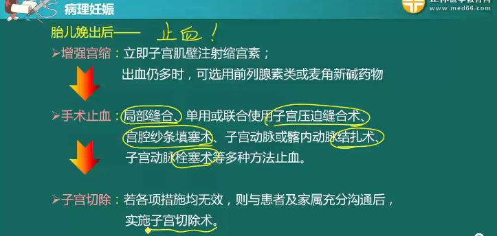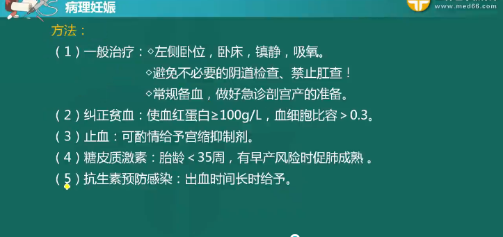 治療原則:抑制宮縮、止血、糾正貧血、預防感染、適時終止妊娠。