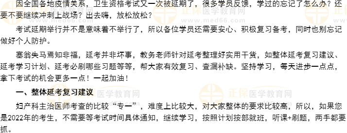 2022婦產(chǎn)科主治醫(yī)師考試延期了,復(fù)習(xí)計(jì)劃應(yīng)該怎么定?一些考生對(duì)于突如其來(lái)的考試延期還沒(méi)做好準(zhǔn)備,復(fù)習(xí)計(jì)劃也不知道怎么制定,為了幫助各位考生備考,醫(yī)學(xué)教育網(wǎng)準(zhǔn)備了婦產(chǎn)科主治醫(yī)師考試延考復(fù)習(xí)計(jì)劃,快get!